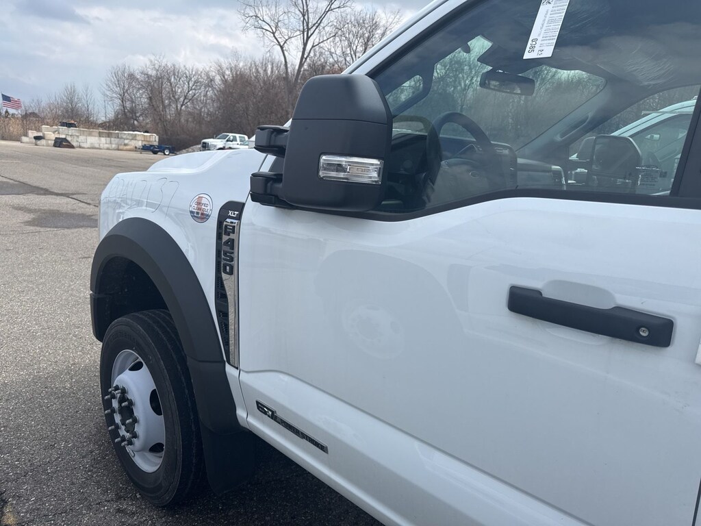 F-450 SuperDuty XLT is nicely equipped with GVWR: 16,500 lb Payload Package, Low Deflection Package, Order Code 653A, XLT Value Package (8-Way Power Driver's Seat, Autolock/Auto Unlock, Electrochromic Rear-View Mirror, Halogen Fog Lamps, Power Adjustable Pedals, Rear Window Defroster, Remote Start, and SecuriCode Driver's Side Keyless Entry Keypad), 350 Amp Dual Alternators, 4 Speakers, 4-Wheel Disc Brakes, 6-Ton Hydraulic Jack, ABS brakes, Air Conditioning, AM/FM radio, AM/FM Stereo w/MP3 Player, Brake assist, Bumpers: chrome, Cloth 40/20/40 Split Bench Seat, Compass, Delay-off headlights, Driver door bin, Driver vanity mirror, Dual front impact airbags, Dual front side impact airbags, Dual rear wheels, Emergency communication system: SYNC 4 911 Assist, Engine Block Heater, Ford Pro Upfit Integration System Removal, Front anti-roll bar, Front Center Armrest w/Storage, Front License Plate Bracket, Front reading lights, Fully automatic headlights, Heated door mirrors, Illuminated entry, Outside temperature display, Overhead airbag, Overhead console, Panic alarm, Passenger cancellable airbag, Passenger door bin, Passenger vanity mirror, Power door mirrors, Power steering, Power windows, Rear anti-roll bar, Remote keyless entry, Speed control, Steering wheel mounted audio controls, SYNC 4 Communications & Entertainment System, Tachometer, Telescoping steering wheel, Tilt steering wheel, Traction control, Trip computer, Turn signal indicator mirrors, Variably intermittent wipers, and Wheels: 19.5" x 6" Argent Painted Steel.